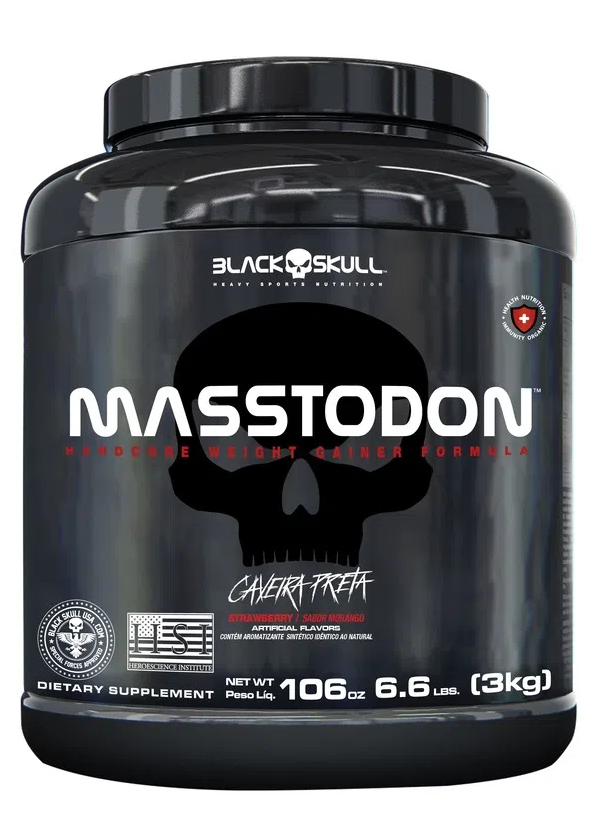 O suplemento hipercalórico MASSTODON™ é um produto da linha Caveira Preta Series™ que entrega por dose 12g de proteínas, 138g de carboidratos, 618 calorias com apenas 2g de gorduras.